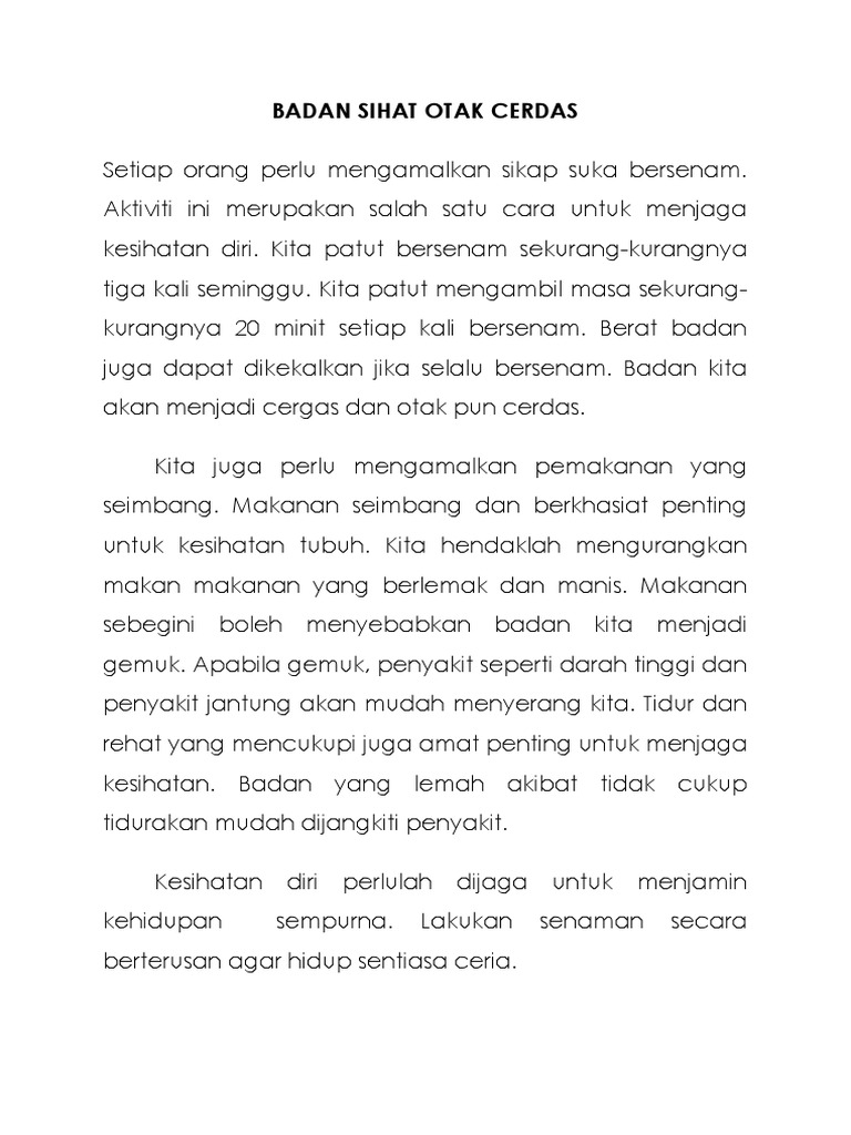 Next postseterusnya ayam yang tangkas di gelanggang. Badan yang bertenaga dan sihat, akan dapat melahirkan pemikiran yang sempurna akalnya. Otak akan menjadi cerdas apabila tubuh badan sihat dan cergas. Laporan refleksi gkk1043 dan kesan senaman terhadap badan. Frasi ed esempi di traduzione: Sebaliknya, otak akan kurang berfungsi sekiranya seseorang itu diserang penyakit. Saifulnizan che ismail 4 years ago. Badan sihat otak cergas vokal. Badan sihat otak cerdas (minus one) | pendidikan kesenian muzik tahun 1. Disebabkan itu, badan pelajar akan sentiasa dalam keadaan segar dan sihat. Badan sihat otak cerdas minus one | lagu pendidikan kesenian tahun 1. Badan kita akan menjadi cergas dan otak pun cerdas. Kami adalah pelajar tahun 5 sk sibujaya dan merupakan peserta yang terlibat dalam program badan cergas otak cerdas yang diadakan sepanjang minggu matematik.